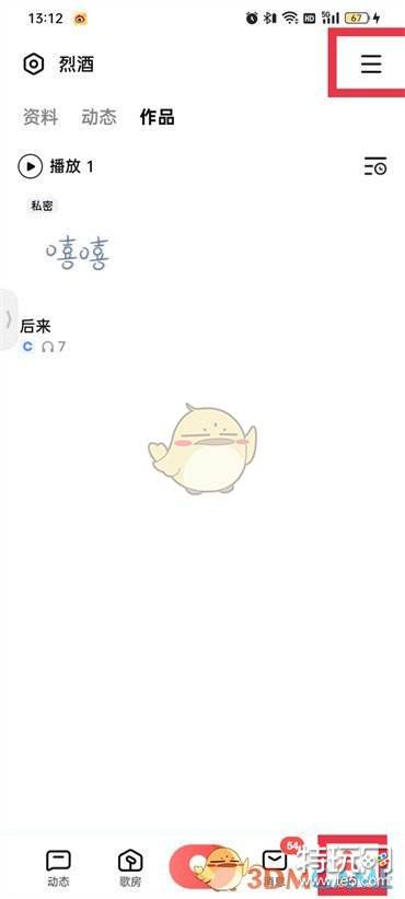 1、打开全民K歌,之后点击右下角的【我】,来到我的页面之后点击右上角的【三横】图标;