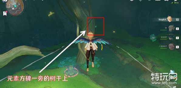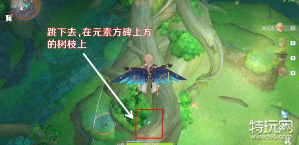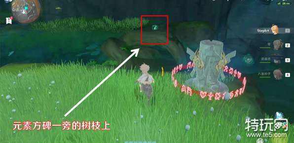 4、树叶一:开启元素视野,可以看到横卧的树干上方有一处亮点,跳下去后触碰即可解锁风元素方碑;