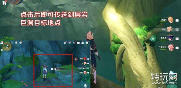 2、在瀑布底部的岩石旁就能找到一个缺口,靠近后有【进入】选项,点击即可传送到层岩巨渊逆重力大树上方;