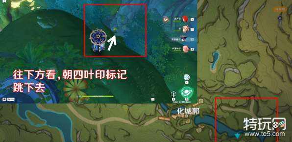 1、传送至须弥化城郭神像,传送后朝南下方看去,可以看到四叶印标记的亮点,朝那里飞下去;