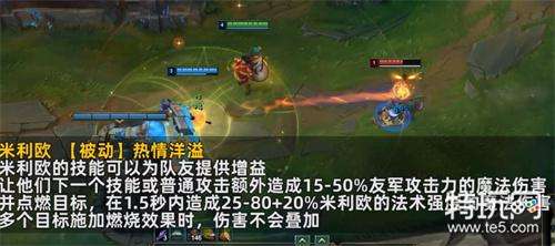 米利欧的技能可以为队友提供增益让他们下一个技能或普通攻击额外造成15-50%友军攻击力的魔法伤害并点燃目标,在1. 5秒内造成25-80+ 20%米利欧的法术强度的魔法伤害多个目标施加燃烧效果时,伤害不会叠加。