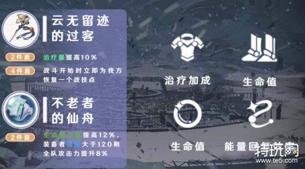 白露的推荐遗器组合为【云无留迹的过客】四件套与【不老者的仙舟】二件套,云无套可以提升白露的治疗量并为队伍额外提供一个战技点,仙舟套可以提升白露的生命值,当白露速度达到120以上后还可以为全队提供攻击力加成。两个套装组合不仅提升了白露的治疗量还赋予了白露全队攻击力增益的功能。