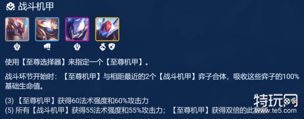 版本更新的机甲羁绊算是极大增强,【战斗机甲】攻击力和法术强度从60/45增强到60/55,也就是说现在5机甲羁绊下,至尊机甲现在可获得55%攻击力与法强。
