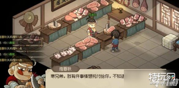 在肉铺店里会遇到庖春秋(名声6级,喜好食物),好感到59后,让我们去找他的家传宝刀。