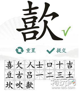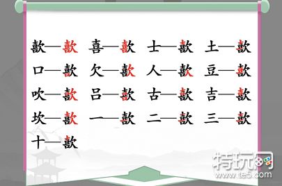 3.最后三个字很多玩家找不到,也是比较简单的字【坎、吹、歖】,我们需要把左边扥部分看成是偏旁部首,再进行组合就可以了,这样17个常见字很快就找到了,很容易就通关了,大家快去试试吧。