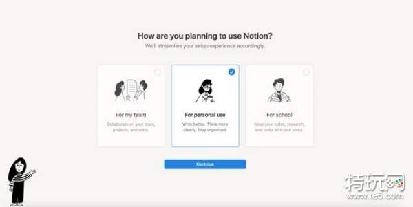 3、填写完昵称、设置完密码就可以进入下一步——选择使用Notion的方式。如果是个人使用,选择中间的for personal use就行。