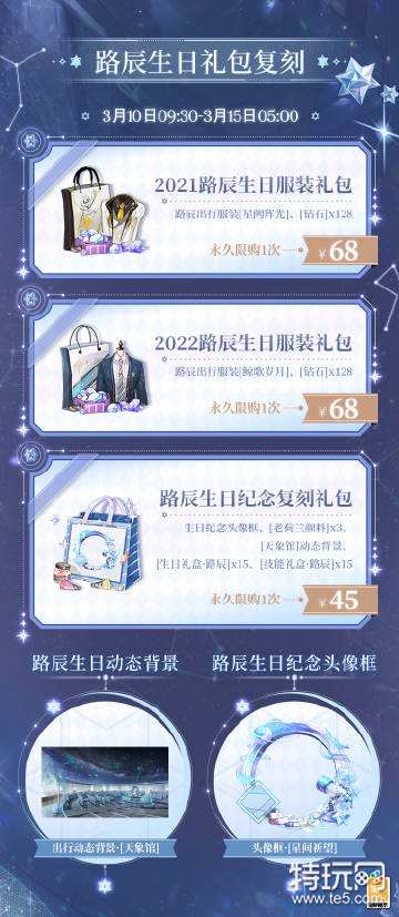 活动内容:路辰[2021生日服装礼包]、[2022生日服装礼包]、[路辰生日纪念复刻礼包]限时上架,欢迎前往[采购]选购。