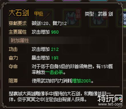 大石剑武器想要获得可以去楚襄城,然后在门口大石像磕头(要体质10)或者拳打(臂力10)就可以直接获得大石剑了。