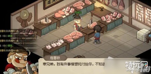 在肉铺店里会遇到庖春秋(名声6级,喜好食物),好感到59后,让我们去找他的家传宝刀。