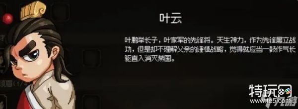 叶云的招募更简单,在叶家军大帐,只要带几个包子给他就能拉好感度,一路直接培养到60后拉进队伍,他虽然攻击范围不大,但高达56级,攻击力异常惊人,前期玩家打狼都很费劲,这哥们一招直接秒一片,有了他你前中期的剧情都能稳定杀,挂机等着云哥出手就完事了。