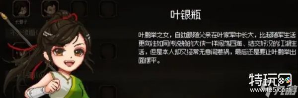 叶银瓶,强度一般般,主要是中期队伍中总要有几个妹妹衬托一下,所以建议招募来打酱油,和叶云在一起,先把好感送到59,然后去霖安城有守卫守着的塔门口触发后续剧情,这里有叶银瓶在追一个贼,我们想办法进去之后击败几个燕子门弟子就可以,注意触发剧情前最好先和守卫把关系提升上去,不然就只能拿银子解决问题了。