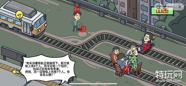 2、20秒再开始操作,等第一个人出来后,点击两次人物①处,控制切换两次铁轨,这个时候出来三个闲人。