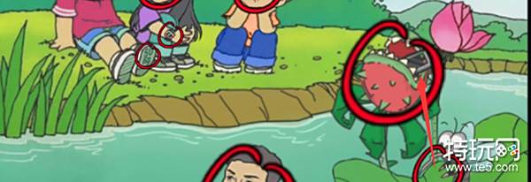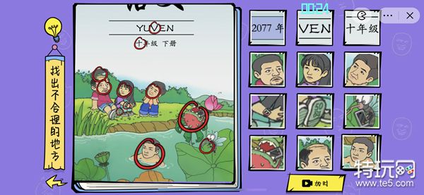 123处不合理分别是:三个人物的脸、出版时间、WEN的拼音、十年级、电话手表、50码鞋子、拿手机的蚊子、食人花、秃头、河里的人