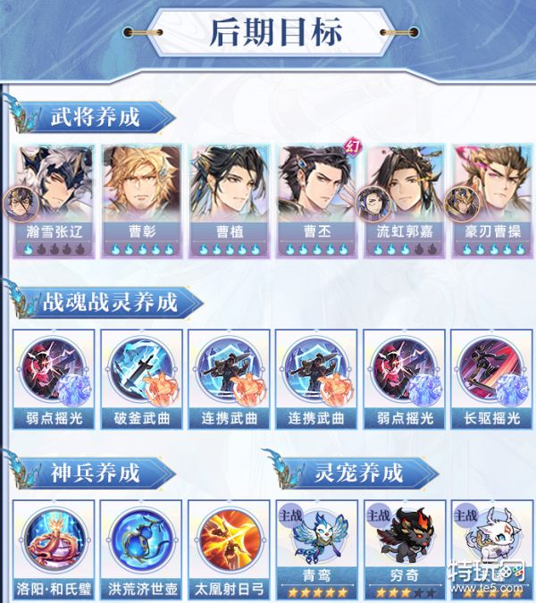 将最终阵容养成至图示阶段就算毕业啦,上阵武将全部五火 (包括魂将羁绊哦), 神兵养至无双3火,灵宠三只均养至5星,风物志方面除了上述的玲珑塔与洛神赋外,山河遗迹“星河影动”赛季产出的独凤鸣与秋风.九霄也提供基础怒,所以优先养成这四个风物志到满星,灵宠方面将毕方补至5星从而增加瀚雪张辽的输出能力,善灵方面使用雀灵来提升瀚雪张辽的普攻收益。