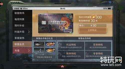 一个月的月卡,他可以返利对应的道具和资源,很需要资源,可以购买一个月卡返利,可以用来日常的消耗。月卡的价格就是300的信用点,300信用点也就是30块,每日返利、联盟会员的特权,可以提升托运特权、签到特权、专享特权。