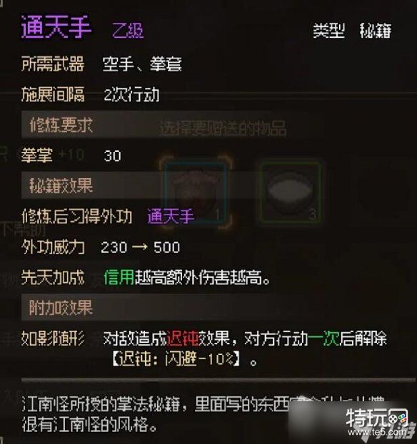 10)在这之后,可以继续提升好感度了,我们选择把江南怪的好感拉满。获得秘籍【通天手】,并得知出城密道的所在。通天手还是非常猛的,信用越高通天手的伤害也越强,还自带迟钝效果。更别说它还是一个群攻技能,能一次攻击三个敌人。