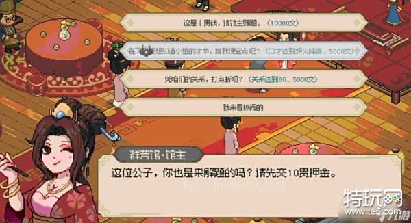 玩家首先到达霖安城,往右进群芳馆,进去要交10000文钱并完成解题任务。玩家需要上交四个任务物品。