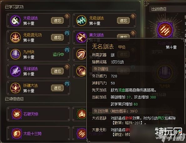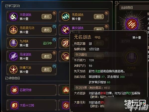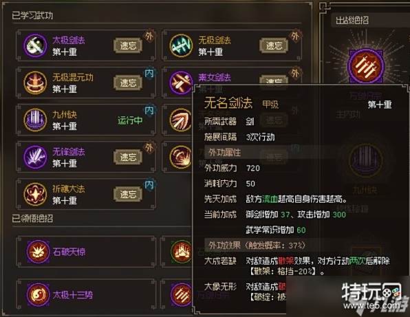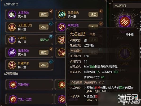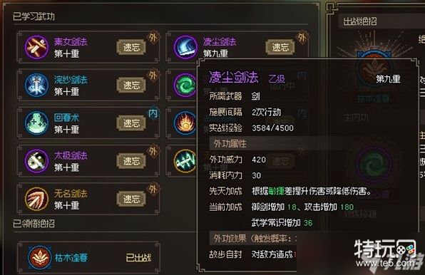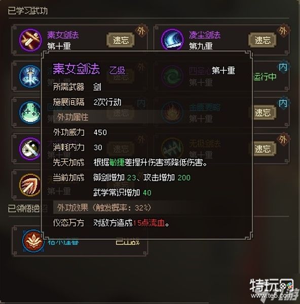另外,武学的级别并不影响触发。下图为曲忘忧的十重素女剑法和九重凌尘剑法的外功触发概率。都是32%。
