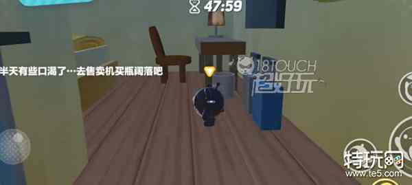2、去前台被告知只剩下一间尾房,在走廊尽头进入电梯到达楼层,在尽头找到自己的房间刷卡进入,在桌前可以放下行李。按照提示去购买可乐。