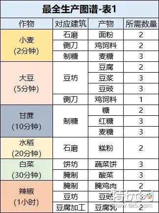 虽然因为等级限制有些还没解锁的就没写进来,但这对于新手理清思路已经足够了,毕竟最基础的作物和建筑就那几个,大家可以结合这三个表来看看自己的经营重点。