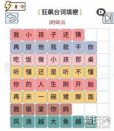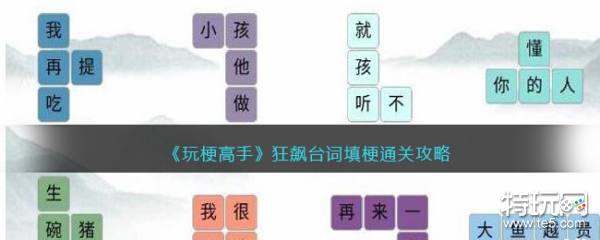玩梗高手是一款最近非常火爆的休闲找茬类手游,大家可以在抖音搜索该游戏去体验!目前游戏已经上线的关卡不少,其中关卡狂飙台词填梗怎么过?这一关有很多的小方块一样的字,需要填入到残缺的字中组成一段完整的话,下面是特玩小编给大家带来的抖音小游戏《玩梗高手》狂飙台词填梗通关攻略,感兴趣的小伙伴们一起来看看吧。