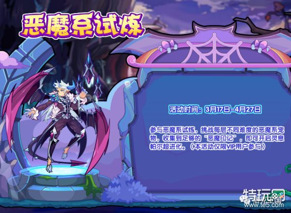 参与恶魔系试炼,挑战每层不同难度的恶魔系宠物,收集到足够的“恶魔印记”,即可开启灵息帕尔超进化。(本活动仅限VIP用户参与)