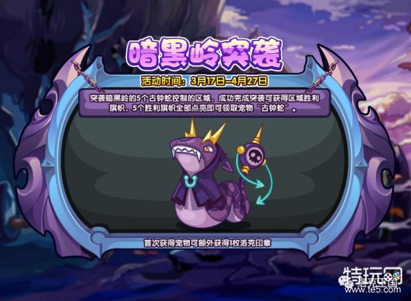 突袭暗黑岭的5个古钟蛇控制的区域,成功完成突袭可获得区域胜利旗帜,5个胜利旗帜全部点亮即可领取宠物“古钟蛇”。