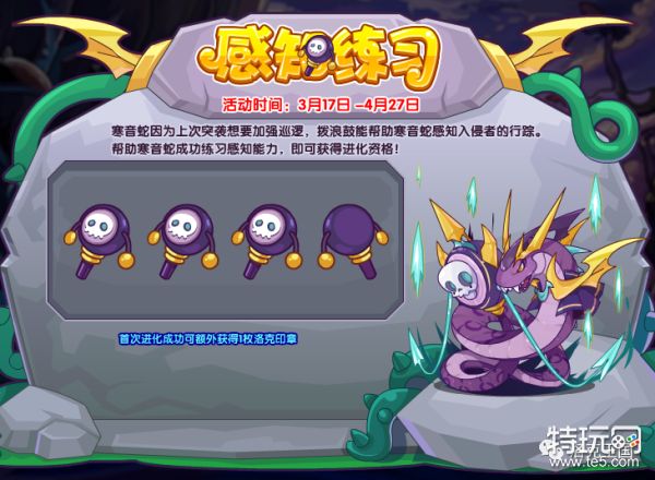 寒音蛇因为上次突袭想要加强巡逻,拨浪鼓能帮助寒音蛇感知入侵者的行踪,帮助寒音蛇成功练习感知能力,即可获得进化资格!