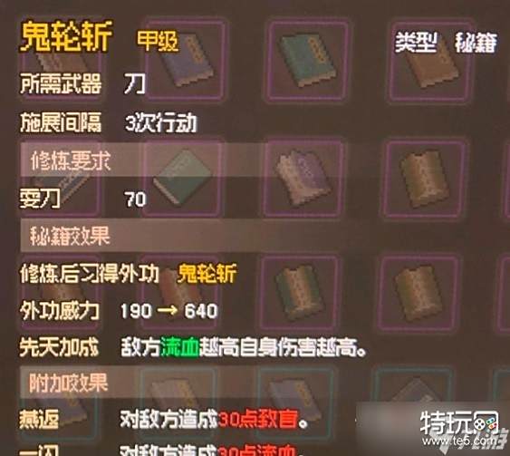 刀法:橙色(鬼轮斩,开化塔二楼鬼子静观其变然后跑路),燕军有个蛮荒刀(目前应该学不到);紫色就庖丁解牛好用点配合鬼子刀流血(肉铺任务)然后剑痴衣服加武器流血一回合能拉满100左右流血,其他的一般般堆属性用。