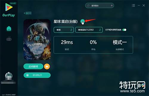 4、将星球重启导入到ourplay(不是ourplay就打开对应的加速器),选择台湾节点