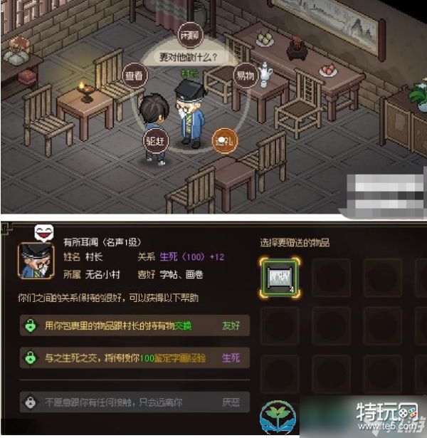 2、随后来到村长堂·正堂找到无名村长,然后去选择赠礼解锁生死之交关系。