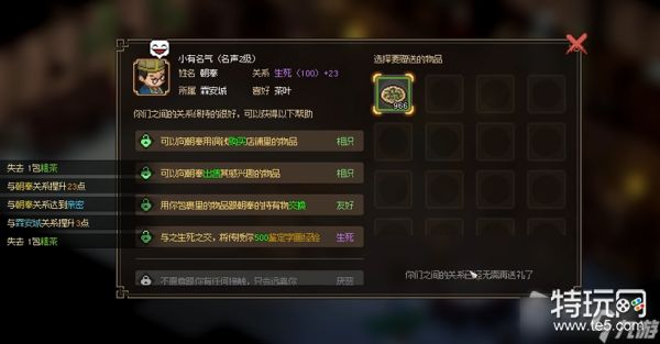 1、赠送粗茶,增加23点好感,关系到达【生死】。