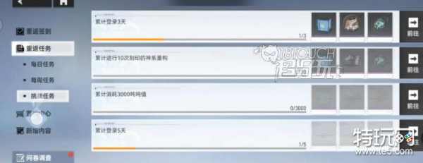 3、触发回归奖励后还会有重返任务,每日完成额外的任务可以获得资源道具奖励,帮助玩家们尽快的提升角色培养进度,更好的追上当前版本;