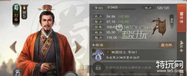 1、刘备的自带战法桃园结义可以为指定目标提供全属性增益,并且之后回合伤害治疗效果分摊,而且每回合还可以为自己和目标友军回复兵力;