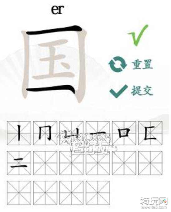 1、在国字的外圈我们可以找到:一、二、冂、凵、匚、口、丨