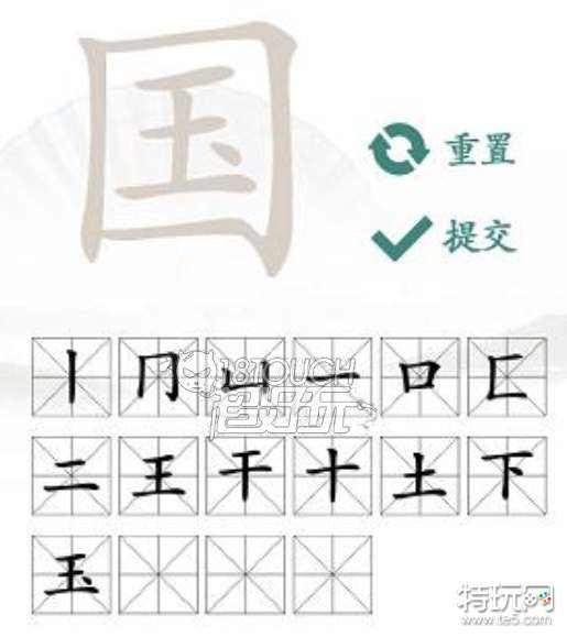 2、然后看国字的内部可以找到:王、干、十、土、下、玉;