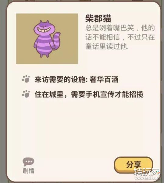 1、柴郡猫顾客的开启方法还是很容易的,在游戏前期只要升级到最高宣传模式,可以轻轻松松就招揽到柴郡猫来餐厅吃饭。柴郡猫的剧情点开,会说这样两段话: