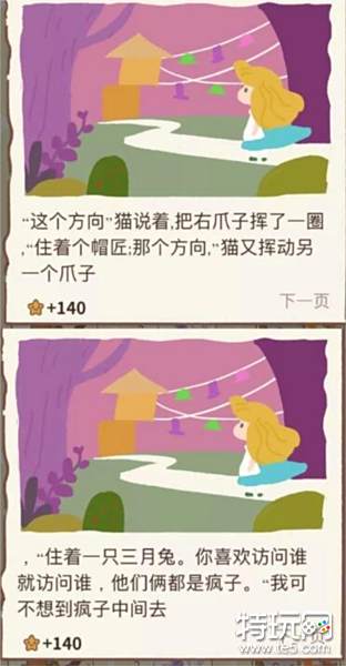 3、柴郡猫给爱丽丝指路,一条路通往一个“帽匠”的家里,一条路通往一个“三月兔”的家里。这两位角色只在这里出现了。