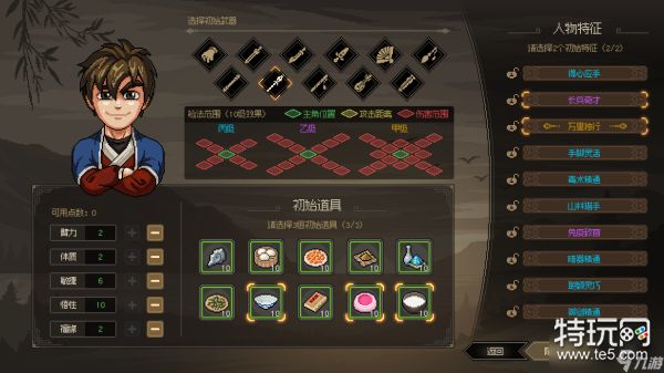 人物特征方面,选择长兵奇才与万里独行,其中长兵奇才的属性长枪+30这没什么好说,主要是这个万里独行,它在没有队友的情况下可以额外增加25的集气速度,这样可以带来更多的速度,而且因为是战棋类型,大家应该都知道这一类的游戏一般速度都是优先考虑。
