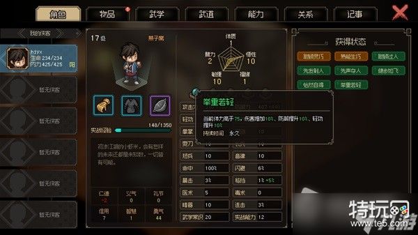 但是不要在意这些细节,这种“人物卡”本身就是这一类游戏重复可玩性的基础,不仅玩家车出来的主角会有,游戏中所有的NPC同样会有,你看他的相关属性、武学等信息,就可以决定了是不是要和他比划比划,还是需要搞好关系义结金兰。