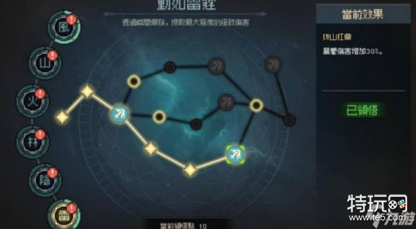 武道方面选择动如雷霆和其疾如风。可以点“动如雷霆”的拔山扛鼎效果,从而增加30%暴击伤害,剩余的点数可以任意分配,若是不点拔山扛鼎效果的话,点趁虚而入,从而增加负面状态也可以。