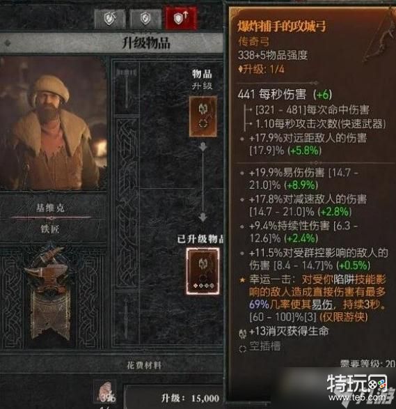 铁匠可以分解装备,也可以升级我们的装备和护甲(不包括首饰)升级武器可以提升伤害,升级防具可以提升护甲。