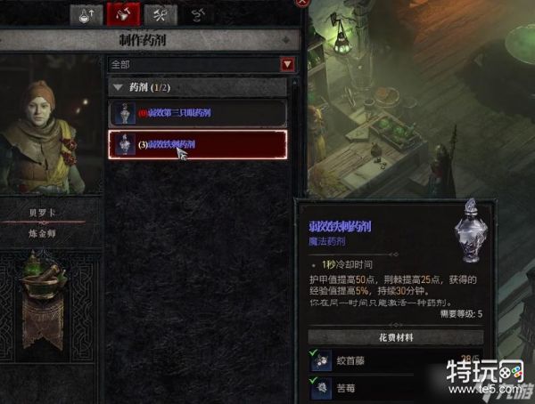玩家找到“弱效铁刺药剂”,花费5个绞首藤和5个苦莓即可制作,可以提供30分钟的经验值提高5%的效果。