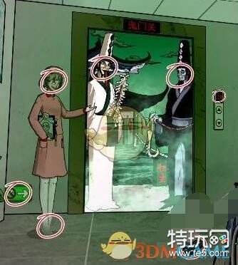 2、点击电梯的下键,电梯中找到【白无常】和【黑无常】、墙边【禁止通行】、护士【诡笑】和【无脚】。