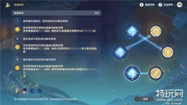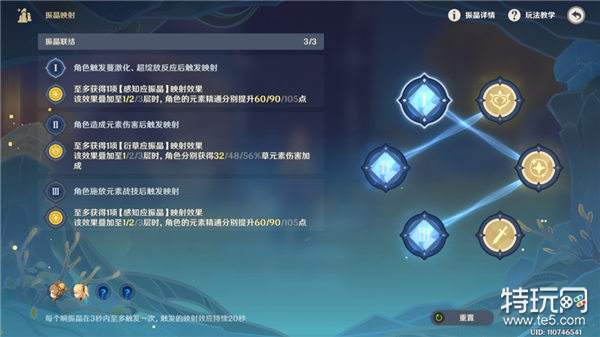 1、触发元素反应后增加元素精通,所以1号「响振晶」连接中间的「应振晶」;