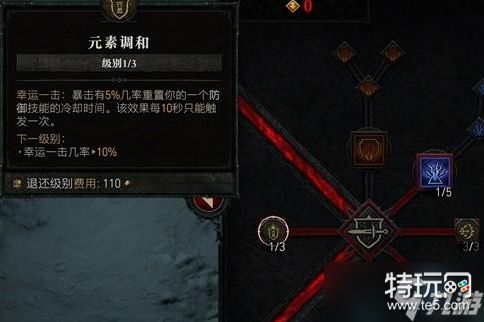 第三列:点出传送,冰盾,一级元素调和和三级的玻璃大炮。元素调和:暴击时5%几率重置你的防御技能冷却时间。效果每10秒只能触发一次。