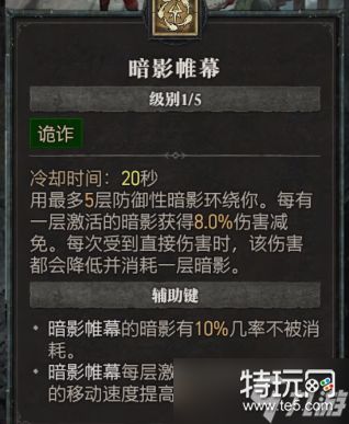 诡诈技能:暗影帷幕,减伤已经后续的解锁暴击 移动强化都很强。18级之后即可解锁暗影灌注。
