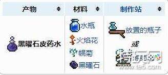 3、在药桌消耗水瓶、火焰花、幌菊和黑曜石合成黑曜石皮药水。使用后玩家将在6钟内获得免疫,不会被熔岩烫伤。