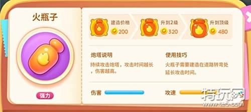 保卫萝卜4绿野奇缘火瓶子有什么效果?保卫萝卜4绿野奇缘火瓶子是持续攻击炮塔,攻击时间越长伤害越高,玩家可以建在转弯处,下面就是小编带来的保卫萝卜4绿野奇缘火瓶子属性一览,快来看看吧!