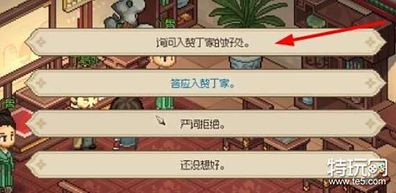 3、询问入赘丁家的好处后,我们离开在戌时之后,子时之前,来到门口再次进入,触发决定入赘丁家事件。